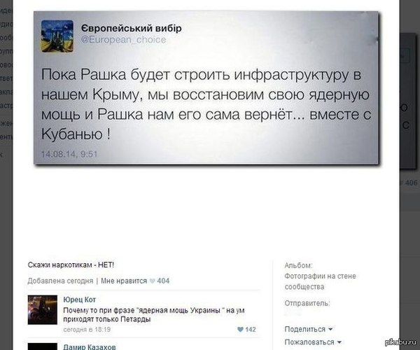По Боингу уже весь цивилизованный мир доказал, и лишь упоротая Россиюшка - я вам ни верю, вы все врьоте, и приводят в аргумент диспетчера по имени Карлос, которого как оказалось не существует)) До последнего отнекивались от чеченцев, и лишь когда стало слишком палевно - обьявили что их 40 человек) Про русских до сих пор отнекиваются,хотя полно даже соцстраниц русских было обнаружено. Есть даже такие духовные, что фоткаються вместе с трупами убитых украинских солдат. Православно, накатим. Уже пороли хрень даже про американцев в нацгвардии, это наверное о том украинце, что сменил гражданство США на украинское, что бы брать участие в АТО. За нас воюют и беларусские добровольцы, и грузинские и польские. Лучше б вспомнили о сербских наемниках, воюющих за сепараторных. Ничего сделать не могут, это освободить больше 80% территории? Спасибо, поржал. И это за 4 месяца, напомнить сколько вы Чечню освободить не могли?)Луганск уже в кольце, скоро будет в кольце Донецк. Но рузке ж не в курсе. Как и не в курсе что АТО началось лишь после того как обьявили о ДНР, и брали с оружием административные здания. Им даже несколько дней дали, что бы те сложили оружие и отправились домой. И лишь тогда Турчинов подписал указ о начале АТО. Потом президентом стал Порошенко и обьявил недельное перемирье. Террористы пошли домой? Нет, срать они хотели на перемирье, они начали палить по армии и нацгвардии (которые нередко рузке воспринимают за одно и то же). Он дал еще 2 дня после недели перемирья. И та же картина. И лишь тогда АТО возобновилось. И беженцев в другие части Украины бежит не меньше, чем в РФ http://www.stopfake.org/fejk-na....-othago - вот про этих поляков пытаються наплести русские СМИ?) http://www.stopfake.org/informa....novniki или вот так вот РФ рассказывает о беженцах. Могу напомнить еще как Путин приврал о количестве работающих в РФ украинцах)